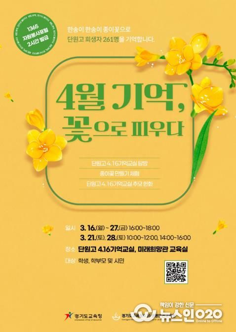 (뉴스인020 = 김성길 기자) 경기도교육청4.16생명안전교육원이 '4월 기억, 꽃으로 피우다’프로그램 참가자를 모집한다.