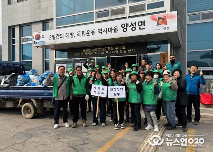 (뉴스인020 = 김성길 기자) 안성시 양성면 새마을지도자회와 새마을부녀회는 지난 11일, 새봄을 맞아 쾌적한 지역 환경을 조성하고자 동항천과 양성면 일대에서 대대적인 환경 정화 활동을 펼쳤다.