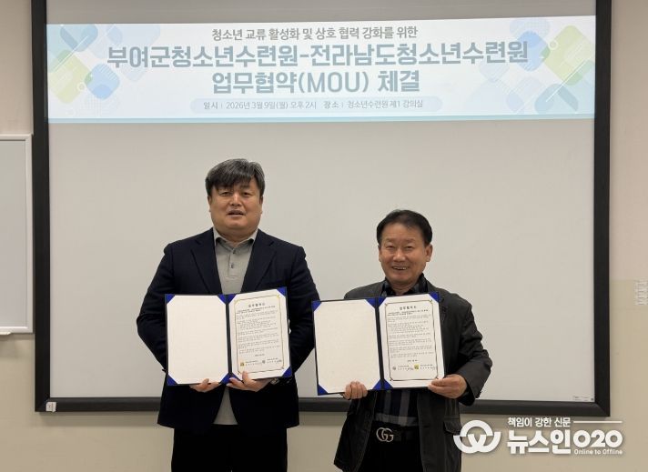 (뉴스인020 = 김성길 기자) 전라남도청소년수련원(원장 이춘복)은 부여군청소년수련원과 상호 교류 및 협력 강화를 위한 업무협약(MOU)을 체결했다고 밝혔다.