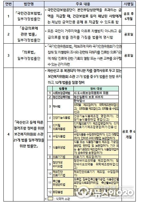 (뉴스인020 = 김나현 기자) 보건복지부는 3월 12일 제433회 국회(임시회) 본회의에서 '국민건강보험법'·'응급의료에 관한 법률'·'의료법' 일부개정법률안, '파산선고 등에 따른 결격조항 정비를 위한 보건복지위원회 소관 21개 법률 일부개정을 위한 법률안' 등 보건복지부 소관 4개 법률안이 의결됐다고 밝혔다.