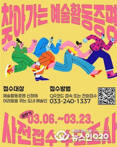 (뉴스인020 = 김성길 기자) 강원문화재단은 도내 예술인의 복지 제도 접근성을 높이기 위한 ‘2026년 상반기 예술활동증명 등록지원 서비스’ 사전접수를 23일(월)까지 진행한다.