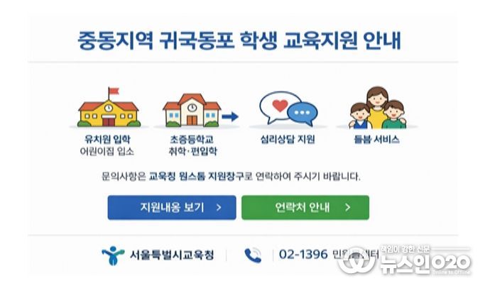 (뉴스인020 = 김성길 기자) 서울특별시교육청은 중동전쟁으로 인해 현지에서 긴급 귀국한 학생들이 안정적으로 학교생활에 복귀할 수 있도록 '중동전쟁 관련 귀국 학생 지원 원스톱 대응 체계 운영계획'을 수립하고 긴급 대응 지원에 나선다고 밝혔다.