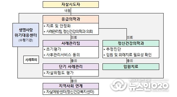 사업 참여 병원에서는 응급치료와 함께 정신건강의학과 진료 의뢰, 초기상담 및 위험도 평가를 실시하고, 병원에서 단기 사례관리(4회)를 거쳐 자살예방센터·정신건강복지센터 등 지역사회 자원으로 연계한다.