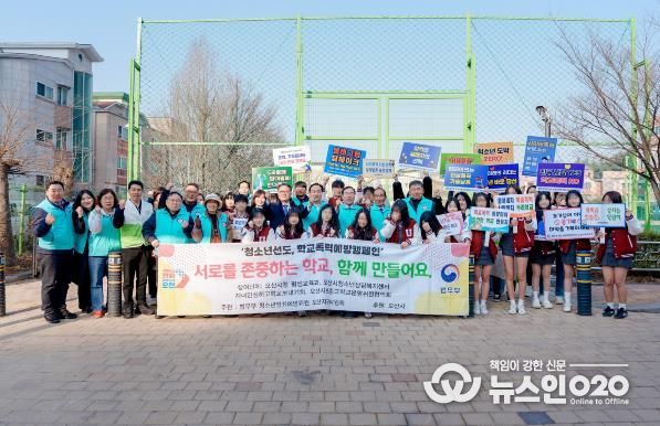 이날 캠페인에는 이권재 오산시장을 비롯해 법무부 청소년 범죄예방위원 오산지구위원회, 오산시청소년상담복지센터, 오산시 초·중·고 학교운영위원협의회, 운천중학교 학생자치회 등 다양한 기관·단체가 참여해 민·관 협력으로 진행됐다.