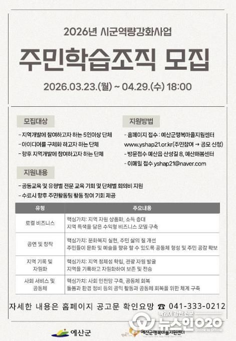 (뉴스인020 = 김성길 기자) 예산군행복마을지원센터는 지역개발에 대한 주민 공감을 이끌어내고 실질적인 지역 현안 해결 아이디어를 구체화하기 위해 ‘2026년 주민학습조직’ 참여단체를 4월 29일까지 모집한다고 밝혔다.