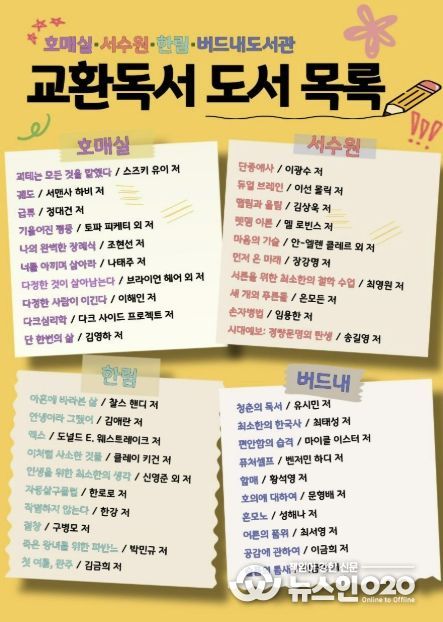 (뉴스인020 = 김성길 기자) 수원시 권선구 4개 공공도서관(호매실·서수원·한림·버드내도서관)이 책을 매개로 서로의 생각과 감상을 나누는 ‘교환독서 클럽’ 참여팀을 모집한다.