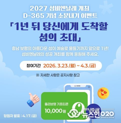(뉴스인020 = 김성길 기자) 섬비엔날레조직위원회는 3월 23일부터 오는 4월 3일까지 약 2주간 섬비엔날레 개최 D-365일을 맞아 대국민 온라인 참여 이벤트를 진행한다고 밝혔다.