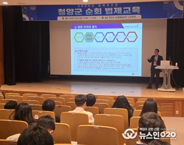 (뉴스인020 = 김성길 기자) 청양군이 자치법규에 대한 공직자들의 이해도를 높이고 법치 행정의 기틀을 다지기 위해 ‘법제처 순회 법제교육’을 실시했다.