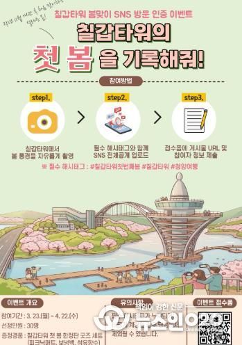 (뉴스인020 = 김성길 기자) 청양군이 지역의 새로운 랜드마크인 ‘칠갑타워’의 첫 번째 봄을 기념해 지난 23일부터 4월 22일까지 한 달간 ‘SNS 방문 인증 이벤트’를 진행한다.