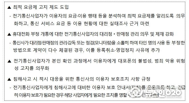 이번 전기통신사업법 개정안은 ①통신사업자가 이용자의 데이터 사용 유형(패턴) 등을 분석하여 최적 요금제를 주기적으로 알림으로써 이용자가 합리적인 요금제 선택을 할 수 있도록 지원하고, ②사기전화(보이스 피싱) 등 범죄 예방을 위해 휴대전화 부정 개통과 관련된 통신사업자의 대리점·판매점 관리 의무 및 제재를 대폭 강화하며, ③침해사고 발생 시 통신사업자의 신속한 대응 체계 구축을 위한 이용자 보호 안내서(매뉴얼) 마련 및 과기정통부의 긴급 조치 명령 근거 마련 등의 내용을 포함한다.