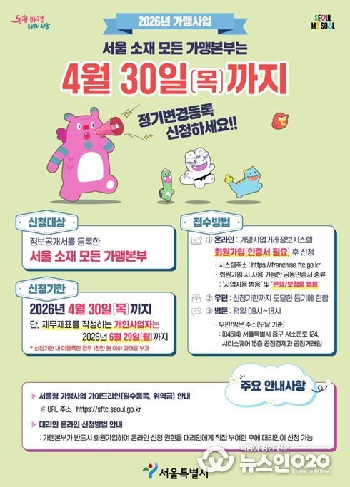 (뉴스인020 = 김성길 기자) 서울시는 서울시에 등록된 모든 프랜차이즈 가맹본부는 4월 30일까지 2025년 사업내용을 반영한 ‘가맹사업 정보공개서 정기 변경등록’ 신청을 완료해야 한다고 밝혔다. 아울러 시는 가맹본부의 변경등록 지원을 위해 3월 26일 온라인 설명회를 개최할 예정이다.