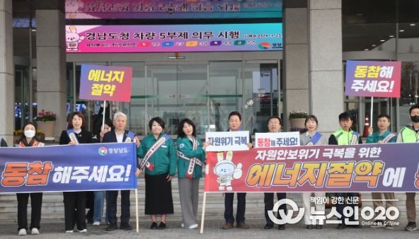 (뉴스인020 = 김성길 기자) 경상남도는 최근 중동 정세 불안으로 인한 에너지 수급 불확실성에 대응하고 국가적 위기 극복에 앞장서기 위해 26일 도청 사거리와 청사 현관 입구에서 ‘에너지 절약 및 차량 5부제 동참 캠페인’을 실시했다.