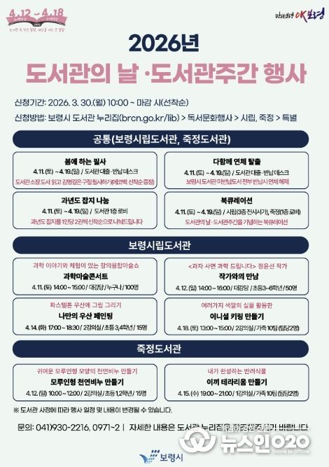 (뉴스인020 = 김성길 기자) 보령시는 2026년 도서관의 날·도서관주간을 맞아 보령시 도서관에서 공연, 강연, 체험, 독서 이벤트 등 다채로운 문화행사를 진행한다고 27일 밝혔다.