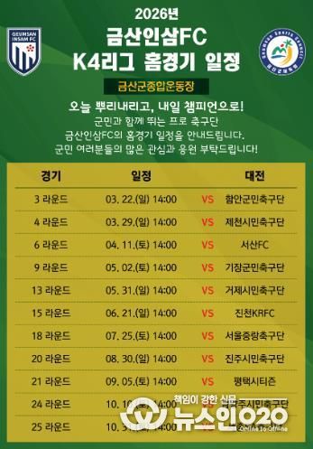 (뉴스인020 = 김성길 기자) 금산인삼에프씨는(FC)는 2026 시즌 케이(K)4리그 안방 사수를 위한 홈경기 일정을 전격 안내에 나섰다.