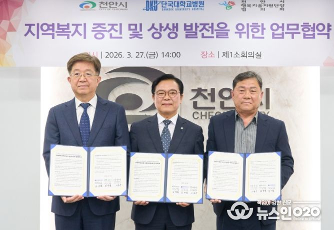 (뉴스인020 = 김성길 기자) 천안시는 27일 시청 제1소회의실에서 단국대학교병원, 천안시행복키움지원단장 협의회와 지역복지 증진 및 상생 발전을 위한 업무협약을 체결했다.