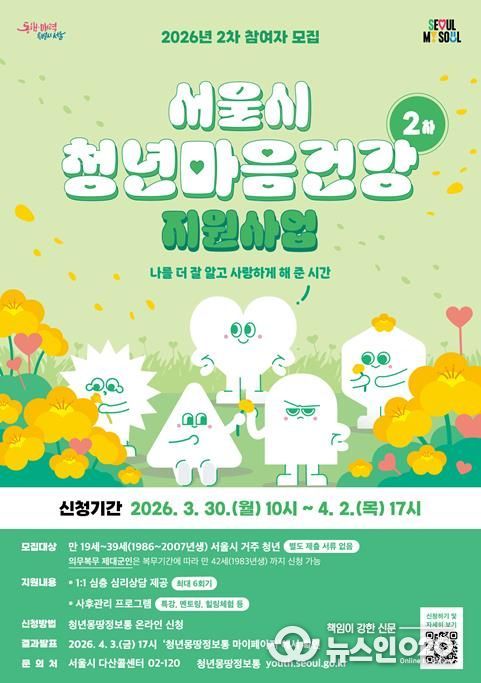 (뉴스인020 = 김성길 기자) 서울시가 청년들의 아픈 마음을 보듬고, 건강한 변화와 성장을 뒷받침하기 위해 ‘서울 청년 마음건강 지원사업’ 2차 참여자 모집에 나선다.