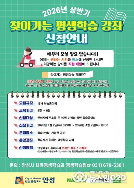 (뉴스인020 = 김성길 기자) 안성시는 시민이 원하는 시간과 장소에서 희망하는 강좌를 수강할 수 있는 '2026년 상반기 찾아가는 평생학습 강좌'를 운영한다고 밝혔다.