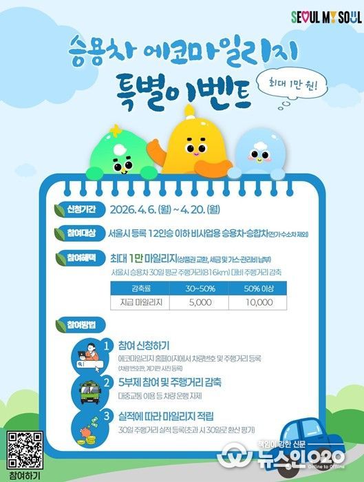수송(승용차) 분야 특별 이벤트는 4월 6일~20일 에코마일리지 홈페이지에서 차량번호·주행거리를 등록해 신청한 뒤, 4~5월 중 30일간 자발적 5부제 참여와 주행거리 감축을 이행하면 최대 1만 마일리지를 받을 수 있다. 정기 승용차 마일리지 참여 시민 역시 이번 특별 이벤트에 참여할 수 있다.