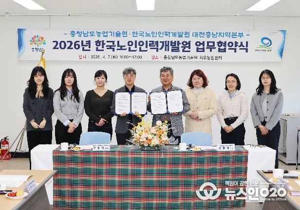 도 농업기술원은 7일 치유농업센터에서 한국노인인력개발원 대전충남지역본부와 ‘농촌자원 현장기반 노인적합형 신직무 활성화를 위한 업무협약’을 체결했다.
