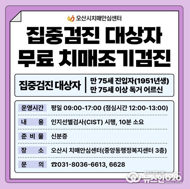 (뉴스인020 = 김성길 기자) 오산시치매안심센터는 치매의 조기 발견과 예방적 관리를 위해 관내 만 75세 진입자(1951년생) 및 만 75세 이상 독거 어르신을 대상으로 치매 집중검진을 실시한다고 밝혔다.