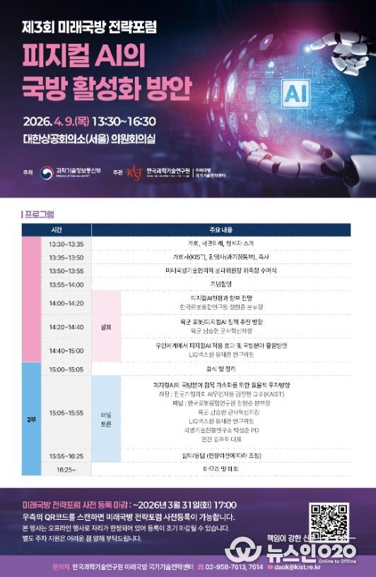 (뉴스인020 = 김나현 기자) 과학기술정보통신부는 한국과학기술연구원(원장 오상록)과 함께 4월 9일 대한상공회의소에서 제3회 미래 국방 전략 토론회(전략 포럼)(‘물리적 인공지능'피지컬AI'의 국방 활성화 방안’)을 개최했다고 밝혔다.
