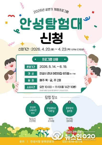 (뉴스인020 = 김성길 기자) 안성시는 관내 어린이집 및 유치원 원생을 대상으로 안성의 역사와 문화를 쉽고 재미있게 체험할 수 있는 프로그램인 '안성 탐험대'를 운영한다고 밝혔다.