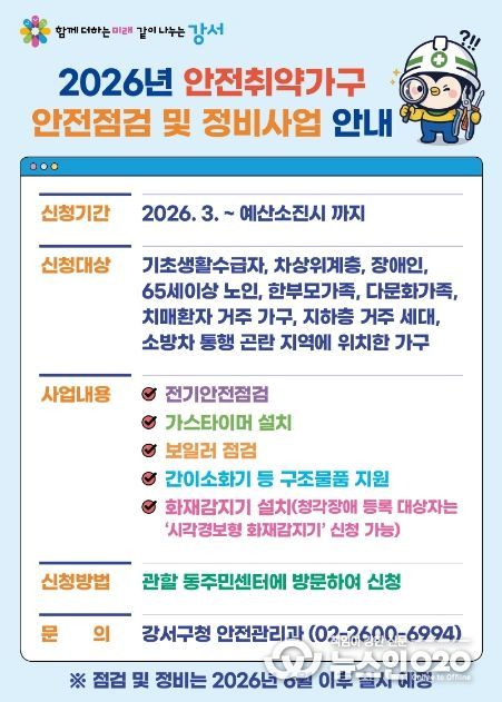 (뉴스인020 = 김성길 기자) 서울 강서구는 화재 및 가스 누출 등 각종 안전사고를 예방하고 취약계층의 안전한 주거환경을 조성하기 위해 안전취약가구에 대한 안전점검을 본격 추진한다.