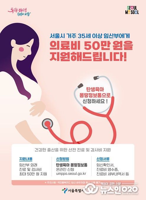 (뉴스인020 = 김성길 기자) 고령 출산 증가로 임신‧출산 의료비 부담이 커지는 가운데, 서울시에 거주 하는 35세 이상 임산부라면 임신 기간 동안 발생한 외래 진료 및 검사비 를 최대 50만 원까지 지원받을 수 있다.