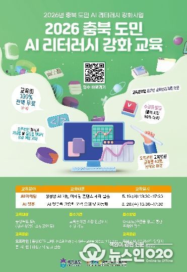 (뉴스인020 = 김성길 기자) 충청북도와 충북과학기술혁신원(원장 고근석)은 AI 일상화 시대에 대응하여 도민의 인공지능(AI) 활용 역량을 강화하기 위해 오는 5월 19일, 5월 20일 '2026 충북 도민 AI 리터러시 강화 교육'을 추진한다고 밝혔다.