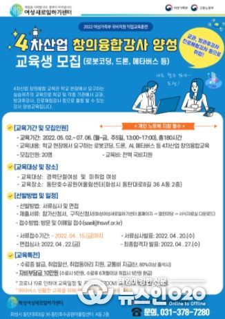 (뉴스인020 = 김성길 기자) (재)화성시여성가족청소년재단(대표이사 김경륜) 화성여성새로일하기센터는 여성가족부가 지원하는 직업훈련교육의 일환인 '4차산업 창의융합강사 양성과정' 교육생을 2022년 4월 15일까지 모집한다.