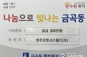 (뉴스인020 = 기자) 지난 29일 수원시 권선구 금곡동 행정복지센터는 한주오토시스템즈(주)로부터 저소득 가정을 지원하기 위한 성금 300만 원을 전달받았다고 밝혔다. 이번에 전달된 성금 300만 원은 금곡동 관내 저소득 가정을 대상으로 한 특화사업 및 맞춤형 복지사업에 활용될 계획이다. 한주오토시스템즈(주) 조성문 대표는 “연말을 맞아 지역 내 어려운 이웃들에게 작은 보탬이 되길 바란다”며 “앞으로도 지역사회와 함께 성장하며 나눔을 실천하는 기업이 되도록 노력하겠다”라고 말했다. 장성임 금곡동장은 “연말을 맞아 어려운 이웃을 위해 따뜻한 나눔을 실천해 주신 한주오토시스템즈(주)에 깊이 감사드린다”며 “앞으로도 지역사회와 상생하는 기업으로 지속적인 역할을 해주시길 기대한다”라고 말했다.