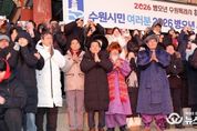 (뉴스인020 = 기자) 이재준 수원특례시장은 1일 아침 팔달산 서장대에서 시민들과 함께 해맞이를 하고, “시민 여러분께서 소망하시는 모든 것을 성취하시길 기원하겠다”고 말했다. 이재준 시장은 “올해도 시민 여러분과 함께 수원을 더 새롭고, 더 빛나게 만들기 위해 노력하겠다”며 “모든 시민이 수많은 역사와 희망을 만드는 멋진 한 해가 되길 바란다”고 기원했다. 서장대 일원을 가득 메운 시민들은 떠오르는 해를 보며 함께 소원을 빌었다. 수원시는 12월 31일 저녁부터 1월 1일 아침까지 일원에서 시민들과 함께하는 송년·신년 행사를 열었다. 12월 31일 밤 10시 30분부터 행궁광장 특설무대에서 ‘제야음악회’가 열렸다. 자정에는 여민각에서 제야 타종 행사를 열고 2026년 병오년(丙午年)의 시작을 알렸다. 이재준 시장, 이재식 수원특례시의회 의장, 김영진(수원시병)·김준혁(수원시정) 의원, 시민 대표 등이 타종했다. 이재준 수원시장과 김현수 제1부시장, 4개 구청장, 실·국장 등은 1일 오전 9시 현충탑을 참배했다.