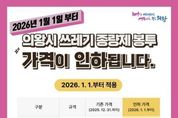 (뉴스인020 = 김성길 기자) 의왕시가 물가 상승 및 경기 침체로 인한 시민들의 경제적 부담을 완화하기 위해 2026년 1월 1일부터 쓰레기 종량제봉투 판매가격을 인하한다. 이번 가격 인하 대상은 일반용 및 재사용 종량제봉투이며, ▲5리터 봉투는 190원에서 150원으로 ▲10리터 봉투는 350원에서 300원으로 ▲20리터 봉투는 680원에서 550원으로 인하된다. 또한, ▲50리터 봉투는 1,700원에서 1,400원으로 ▲75리터 봉투는 2,630원에서 2,100원으로 각각 조정된다. 가격 인하 이전에 구매한 종량제봉투는 그대로 사용 가능하고, 음식물 종량제봉투, 공사장 생활폐기물 포대, 대형폐기물 신고필증은 가격 등은 변동 없다. 김성제 시장은 “종량제봉투는 시민 생활과 밀접한 만큼, 이번 가격 인하가 가계 부담 완화에 도움이 되길 바란다”며, “가격 인하 시점이 2026년 1월 1일이므로, 그전까지 각 가정에서 필요한 양만 구입해 주시길 바란다”고 전했다.
