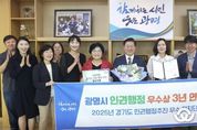 (뉴스인020 = 김성길 기자) 광명시가 경기도가 선정하는 인권 행정추진 우수 기관으로 3년 연속 선정되며 인권 선도 도시로 확고히 자리매김했다. 시는 지난 9월 30일 경기도청 다산홀에서 열린 ‘2025년 경기인권포럼’에서 경기도 인권 행정추진 우수 자치단체 경기도지사 표창을 받았다. 경기도는 31개 시군을 대상으로 인권행정 제도와 정책 추진 성과를 종합 평가해 5개 우수 자치단체를 선정했으며, 광명시는 평가 제도가 도입된 2023년부터 올해까지 매년 수상하는 성과를 거뒀다. 이번 수상은 ▲인권행정 제도 구축(인권조례제정, 인권위원회 구성 및 운영, 인권교육 실시 등), ▲인권정책 수립(인권기본계획 수립 및 연도별 시행계획 수립, 인권실태조사 및 인권영향평가, 인권문화행사 등) ▲지역사회 인권증진 활동 ▲시민 인권 보장과 존중 문화 확산 등 전반적 성과를 전문가들로부터 인정받은 결과다. 광명시는 2012년 지방자치단체 최초로 ‘광명시민인권센터’를 개소하고, ‘인권보장 및 증진 5개년 기본계획’ 수립하는 등 인권 친화적 행정의 기틀을 마련해 왔다. 특히 인권기본계획에 재개발·재건축이 많
