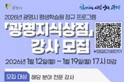 (뉴스인020 = 김성길 기자) 광명시 평생학습원이 시민 맞춤형 평생학습 프로그램 ‘광명지식상점’을 운영할 2026년도 전문 교육 강사를 공개 모집한다. ‘광명지식상점’은 시민의 삶과 밀접한 주제를 중심으로 배움과 성장을 지원하는 광명시 대표 평생학습 프로그램이다. 2026년에는 ▲미래기술 ▲직무역량 ▲재무설계 ▲인문성찰 ▲관계학습 ▲시민학습 ▲기타 제안과정 등 7개 분야에서 강사를 선발해 시민들에게 다채로운 교육 서비스를 제공할 예정이다. 지원 자격은 해당 모집 분야의 전문성을 보유하고 관련 자격증과 실무경력을 모두 갖춘 자에 한한다. 시는 강의 경력, 강의계획서, 자기소개서 등을 바탕으로 1차 서류심사를 진행한 뒤, 수업 시연과 질의응답으로 구성된 2차 면접심사를 거쳐 최종 40여 명의 강사를 선발할 계획이다. 접수는 오는 12일부터 19일 17시까지 이메일 또는 평생학습원 2층 사무실 방문을 통해 가능하다. 제출 서류 등 세부 사항은 광명시 평생학습플랫폼 ‘광명이(e)지’ 공지사항에서 확인할 수 있다. 최종 합격자는 2월 중 ‘광명e지’에서 발표하며, 선발된 강사진은 3월부터 본격