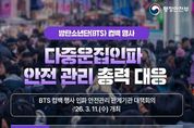 (뉴스인020 = 김나현 기자) 방탄소년단(BTS) 컴백 행사 다중운집인파 안전 관리 총력 대응 - BTS 컴백 행사 인파 안전관리 관계기관 대책회의 '26.3.11.(수) 개최 ▲ 행정안전부 - 다중운집인파 재난 위기경보 '주의' 단계 발령 일시: 3.21.(토) 00:00~24:00 / 지역: 서울 종로구·중구 - '정부합동안전점검단' 구성, 안전관리 실태 사전 점검 ▲ 문화체육관광부 - 공연 안전을 위한 자문 및 무대시설·객석 점검 ▲ 보건복지부 응급 환자 발생 대비, 재난의료지원팀(DMAT) 및 보건소 신속대응반 출동체계 사전 구축 ▲ 경찰·소방 - 행사장 주변 질서 유지 및 치안 확보, 대테러 방지 활동 - 구조·구급요원·구급차 현장 배치 ▲ 서울시 - 시민안전대책본부 가동, 안전관리계획 이행 여부 확인 - 안전 안내 문자 발송 및 질서 있는 관람 유도