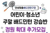 (뉴스인020 = 김성길 기자) 안성시시설관리공단은 안성 시민 생활체육 활성화를 위해 현재 운영 중인 주말 어린이・청소년 배드민턴 강습반 정원을 확대하고 추가 수강생을 모집한다고 밝혔다. 이번 주말 어린이・청소년 배드민턴 강습반은 개설 이후 학부모와 수강생들의 높은 관심 속에 연일 정원이 마감될 정도로 큰 호응을 얻고 있다. 특히 주말을 활용해 어린이와 청소년들이 체계적으로 생활 체육을 접할 수 있다는 점에서 학부모들의 만족도가 높은 프로그램으로 자리 잡고 있다. 공단은 이러한 시민 수요를 적극 반영하기 위해 강습반 정원을 기존보다 확대하고, 오는 3월 23일 오전 9시부터 3월 31일 오후 10시까지 초등학생부터 고등학생까지의 어린이·청소년을 대상으로 선착순 10명을 추가 모집한다. 신청은 실내체육관 사무실에 전화로 문의한 뒤 방문 접수로 진행될 예정이다. 이정찬 이사장은 “시민들의 높은 관심에 부응하기 위해 앞으로도 누구나 쉽게 참여할 수 있는 생활체육 환경을 만들어 가겠다”고 전했다. 현재 안성시시설관리공단에서는 시민들의 건강증진을 위하여 주말 강습반 외 매주 2회(화,목) 오전‧오후‧저녁‧시
