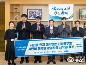(뉴스인020 = 김성길 기자) 박승원 광명시장이 민원 최일선에서 시민을 위해 헌신하는 친절공무원을 만나 격려하고, 시민 중심 행정의 가치를 강조했다. 박 시장은 31일 시장 집무실에서 시민의 입장을 먼저 생각하며 친절하고 책임감 있는 민원 행정을 실천한 하반기 ‘광명시 친절공무원’을 초청해 격려의 시간을 가졌다. 박 시장은 이날 하안4동 권덕진, 수도과 남윤기, 보육정책과 박영찬 주무관 등 하반기 친절공무원으로 선정된 직원들과 소통하며 “민원 현장에서의 친절은 시민에 대한 책임이자 행정의 신뢰를 만드는 출발점”이라며 “‘모든 권력은 시민으로부터 나온다’는 시정 철학 아래, 모든 공직자가 시민의 입장을 우선에 두고 업무를 수행할 수 있도록 적극 지원하겠다”고 말했다. 보육정책과 박영찬 주무관은 “민원 업무를 하다 보면 어려운 순간도 있지만, 시민의 이해와 공감이 전해질 때 보람을 느낀다”며 “앞으로도 “시민의 입장에서 한 번 더 생각하며 성실한 민원 서비스를 제공하겠다”고 소감을 밝혔다. 광명시는 이번 하반기 친절공무원 선발을 위해 시민으로부터 시 소속 6급 이하 공무원 36명을 추천받았다. 이후