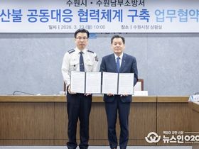(뉴스인020 = 김성길 기자) 수원특례시가 수원남부소방서와 산불 공동대응체계를 강화해 산불이 발생했을 때 더 신속하고, 효율적으로 대응한다. 수원시와 수원남부소방서는 23일 시청 상황실에서 ‘산불 신속 대응을 위한 업무협약’을 체결하고, 협력을 약속했다. 양 기관은 이번 협약으로 상시 협업체계를 구축하고, 최근 증가하는 산불에 대한 현장 대응력을 높인다. ▲산불이 발생했을 때 즉시 상황 정보 공유, 비상연락망 유지 ▲인력·장비 신속하게 동원 ▲합동 훈련 등으로 공동 대응체계를 강화하기로 했다. 이날 협약식에는 이재준 수원시장과 박정훈 수원남부소방서장 등이 참석했다. 박정훈 수원남부소방서장은 “이번 협약이 산불에 대한 경각심이 커지는 계기가 되길 바란다”며 “시민들이 산불 피해 없이 안전하게 살아갈 수 있도록 최선을 다하겠다”고 밝혔다. 이재준 수원시장은 “산불이 발생할 때마다 최선을 다해 신속하게 진화해주신 소방서에 감사드린다”며 “소방서의 신속한 진화 덕분에 산불이 많이 번지지 않을 수 있었다”고 말했다. 이어 “앞으로 협력을 더 강화해 산불을 예방하고, 시민 안전을 함께 지키자”고