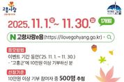 (뉴스인020 = 김성길 기자) 고흥군은 유자향이 가득한 11월을 맞아 고향사랑기부제 참여자에게 감사의 마음을 전하기 위해 ‘고흥애(愛) 연말정산 이벤트’를 11월 30일까지 운영한다고 밝혔다. 이번 이벤트는 연말정산 시즌을 앞두고 기부자들의 관심이 높아지는 시기에 맞춰 마련된 것으로, 기간 내 고흥군에 10만 원 이상 기부한 참여자 중 500명을 무작위로 추첨해 다이소 모바일 상품권(1만 원권)을 증정한다. 군은 이번 행사를 통해 연말정산 시 세액공제 혜택(10만 원 전액, 초과분 16.5%)을 다시 한번 알리고, 고흥의 대표 농수특산물 답례품을 함께 홍보할 계획이다. 답례품으로는 ▲2025년산 햅쌀 ▲향기로운 유자 제품 ▲김 ▲고흥 한우 ▲나로도 삼치회 등 청정 고흥을 대표하는 품목이 인기를 끌고 있다. 특히 11월에는 고흥유자축제(11.6.~9.)와 연계한 현장 홍보를 강화해 향우와 관광객을 대상으로 기부 참여를 독려할 예정이다. 군 행정과 관계자는 “고흥의 유자향처럼 따뜻한 마음이 전국으로 퍼져나가길 바란다”며 “기부금은 아동·청소년 복지, 문화·의료 인프라 확충 등 군민의 삶의