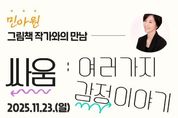 (뉴스인020 = 김성길 기자) 광양용강도서관은 오는 11월 23일 오후 2시, 마로극장에서 초등학교 1~3학년 어린이를 대상으로 그림책 『싸움』의 저자 민아원 작가와의 만남을 운영한다고 밝혔다. ‘싸움: 여러 가지 감정 이야기’를 주제로 한 이번 작가와의 만남은 어린이들의 감수성과 사회성을 높이고, 건강한 자아와 관계 형성에 도움을 주기 위해 마련됐다. 함께 읽을 도서 『싸움』은 뾰족뾰족한 마음이 만나 별이 되는 이야기를 담은 그림책으로, 갈등 속에서도 서로의 감정을 이해하고 함께 성장해 가는 모습을 유쾌하면서도 따뜻하게 그려냈다. 참가 인원은 25명이며, 신청은 11월 10일 오전 10시부터 시립도서관 누리집에서 선착순으로 접수한다. 김현숙 도서관과장은 “이번 만남은 지역 어린이들이 평소 그림책을 통해서만 접하던 작가와 직접 대화할 수 있는 뜻깊은 자리”라며 “아이들이 작품과 더 깊이 친해지고, 독서의 기쁨을 발견하는 계기가 되길 바란다”고 말했다. 기타 자세한 사항은 광양시립도서관 누리집 문화행사 게시판을 확인하거나, 광양용강도서관 으로 문의하면 된다. 한편, 민아원