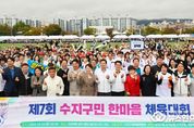 (뉴스인020 = 김성길 기자) 용인특례시 수지구는 18일 아르피아 상부 체육시설에서 ‘제7회 수지구민 한마음 체육대회’를 개최했다. 수지구 체육연합회가 주최·주관한 이번 대회엔 구민 약 2000여 명이 참여해 승부차기, 볼풀공 바구니농구, 줄다리기, 계주 등으로 구민 모두 한마음으로 어우러지는 시간을 보냈다. 또 식전 공연인 동천동 훌라댄스, 신봉동 밸리댄스와 단국대학교 치어리딩팀 ‘아스테르’의 공연, 퓨전 장구, 보컬그룹 ‘뮤랑’, 마술사 홍승인, 초대 가수 김성환 등이 다채로운 무대를 선보였다. 행사장 곳곳에선 화분 만들기, 친환경 리필스테이션(세제 담아가기), MBTI 검사, 캘리그라피 체험, 키링 만들기, 구민 건강 서비스 안내 부스 등 체험 프로그램이 운영됐다. 이상일 시장은 “우리 수지구민들이 모처럼 한자리에 모여 우정을 나누면서 행사를 통해 행복한 시간을 많이 보내시라고 비가 그친 것 같다”며 “수지중앙공원은 축구장 76개 크기의 시민 힐링 공간으로 조성되고 있고, 상현3동 행정복지센터와 함게 건립되는 광교스포츠센터에는 25m레인 10개의 수영장이 들어서게 된다"며 "서울종합운동장역과