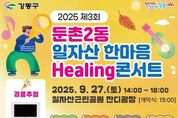 (뉴스인020 = 김성길 기자) 강동구 둔촌2동은 오는 27일 일자산근린공원 잔디광장에서 ‘제3회 둔촌2동 일자산 한마음 Healing 콘서트’를 개최한다고 밝혔다. 올해로 세 번째를 맞는 이번 콘서트는 둔촌2동 주민자치회가 주최하고 동주민센터가 지원하며, 다양한 먹거리, 체험 프로그램, 주민참여 버스킹, 아트 공연, 초대가수 무대 등으로 꾸며져 지난해보다 한층 풍성한 주민참여형 지역축제로 마련됐다. 이날 콘서트는 오후 2시 둔촌2동 자치회관 프로그램 공연과 주민 가수 구한나 씨의 식전 무대로 시작한다. 이어 오후 3시 개막식을 열고, 주민참여 버스킹, 버블·벌룬 아트 공연, 관내 중학교 동아리 공연, 초대 가수 무대 등이 이어진다. 특히 폐막 무대에서는 가수 김소진·김명진·홍원빈이 함께하는 공연이 펼쳐져 한층 수준 높은 문화공연을 선보일 예정이다. 또한 다양한 먹거리를 판매하고 가훈 써주기, 당찬 슈팅존, 나만의 당찬 텀블러 만들기, 힐링 스티커 붙이기 등 다양한 체험 프로그램이 무료로 진행된다. 아울러 스티커 붙이기에 참여한 관람객에게는 추첨권을 배부해 TV, 자전거, 무선 이어폰 등 푸짐한 경