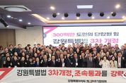 (뉴스인020 = 김성길 기자) 강원특별자치도 범국민추진협의회(협의회장 최양희, 추진단장 김천수)가 11월 21일 11시, 춘천 스카이컨벤션 2층 컨벤션홀에서 강원특별법 3차개정 조속 통과 촉구 결의대회를 개최했다. 당초 정기총회를 개최할 예정이었으나 어제(11월 20일) 국회 행정안전위원회 법안소위에서 강원특별법 3차 개정이 논의가 불발되자 긴급 행동에 나섰다. 이날 결의대회에는 범추협 위원들을 비롯해 고문직을 맡고 있는 김진태 도지사, 김시성 도의회 의장 등 200여 명이 참석하여 조속 통과를 촉구하는 목소리를 높였다. 최양희 협의회장은 “오늘은 강원특별자치도의 성과를 함께 축하하는 날이 돼야 했지만, 어제 행안위에서 3차 개정을 또 미루는 바람에 오히려 우리의 결의를 더 크게 보여줘야 하는 날이 됐다”라며, “각 지역에서 올라오신 위원 여러분의 지혜와 네트워크가 어느 때보다 절실하다”라고 말했다. 김진태 강원특별자치도지사는 “3차 개정안이 처음 국회에 올라간 게 작년 9월인데, 1년이 넘도록 단 한 번도 심사를 하지 않았다”라며, “5극 3특을 강조하면서 특별자치도 법은 시간이 없다고 국회 심사가 미