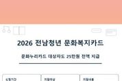 (뉴스인020 = 김성길 기자) 전라남도는 2026년부터 전남 청년 문화복지카드 사업 추진 시 경제적 취약 계층(기초생활수급자·차상위계층)이 수혜를 받는 문화누리카드 지급자에게도 25만 원 전액을 지급한다고 밝혔다. 전남청년 문화복지카드는 청년의 문화 향유 기회를 넓히고 자기 계발을 돕기 위해 2022년부터 시행하고 있다. 전국 최초로 소득 기준 없이 청년에게 문화복지비를 10년간 최대 250만 원을 지원한다. 이를 통해 청년은 공연 관람, 학원 수강, 도서 구입, 체육시설 이용 등 다양한 문화·복지 혜택을 받을 수 있다. 기존 전남청년 문화복지카드는 전남에서 2년 이상 주소를 두고 거주한 19세 이상 28세 이하 청년에게, 1인당 연 25만 원을 지원했지만, 문화누리카드 수혜를 받는 신청자에 한해서는 문화누리카드 수혜액을 차감한 금액만 지급했다. 전남도는 취약계층 청년의 실질 지원액이 줄어 형평성 문제를 해결하기 위해 보건복지부 사회보장협의 개선 건의를 통해 복지 불균형을 해소하고 청년의 문화향유권을 보장하기 위해 제도 개선을 추진했다. 이후 1년여 노력 끝에 결실을 봐