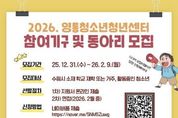 (뉴스인020 = 기자) 수원시청소년청년재단 영통청소년청년센터가 2026년 활동에 함께할 청소년 참여기구 및 동아리 참가자를 모집한다. 모집 대상은 청소년운영위원회, 놀이동아리, 문화예술동아리연합 총 3개 분야이며, 선발 인원은 약 100명이다. ▲청소년운영위원회는 기관 운영 전반에 대해 청소년이 직접 의견을 제안하는 활동으로, 청소년의 주도성과 참여를 강화한다. ▲놀이동아리는 공동체 기반 놀이를 통해 건강한 또래 관계를 형성하고, ▲문화예술동아리연합은 댄스·밴드 등 다양한 장르에서 청소년의 문화예술 역량을 강화하는 동아리이다. 참여기구 및 동아리는 2026년 한 해 동안 진행되며, 센터의 주요 사업과 연계된 다양한 프로젝트에 참여하게 된다. 참여기구 및 동아리 모집 기간은 2026년 2월 9일까지이며, 신청은 홍보물 내 QR코드를 통해 온라인 신청서(네이버폼)를 작성해 제출하면 된다. 선발된 청소년들은 다양한 프로그램을 주도적으로 운영하게 된다. 영통청소년청년센터 관계자는“참여기구 및 동아리 활동은 청소년이 단순 참여자가 아닌, 스스로 활동을 만들어가는 주체로 성장할 수 있는 기회”라며 “다양한 관심과 열정
