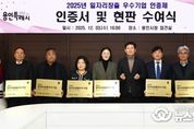 (뉴스인020 = 김성길 기자) 용인특례시는 3일 본관 4층 전겹실에서 일자리 창출에 힘쓴 지역 우수기업 8곳에 인증서와 현판을 수여했다. 이번에 선정된 기업은 ▲아산디앤씨 주식회사 ▲일승푸드 제2공장 ▲주식회사 에이치에스씨 ▲㈜인실리코젠 ▲주식회사 홈체크 ▲㈜휴먼인텍 ▲케이제이건설산업(주) ▲트루션 등 총 8개사다. 시는 1차 서류심사와 2차 현장실사를 거쳐 일자리 창출 실적, 고용 안정성, 기업의 성장 가능성, 근로환경 등을 종합적으로 평가해 우수기업을 선정했다. 이들 기업은 최근 1년간 총 74명(기업당 4~19명)을 신규 채용해 지역 내 일자리 창출에 기여했다. 또, 다양한 직원복지제도로 근무하기 좋은 환경을 조성해 일자리의 질을 높이는 데 크게 힘쓴 것으로 평가됐다. 이들 기업에는 인증서와 현판이 수여되며, 시가 주최하는 일자리사업, 기업지원사업 참여 시 가점이 주어진다. 일자리박람회 등 채용 행사에도 우선적으로 참여할 수 있다. 용인특례시 일자리창출 우수기업 인증제는 2018년부터 시행되고 있으며, 매년 고용 확대와 일자리 창출에 기여한 기업을 발굴·지원하고 있다