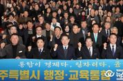 (뉴스인020 = 김성길 기자) 전라남도와 광주광역시는 2일 나주에서 전남·광주 행정통합 추진 제6차 추진협의체 회의를 열어 국회에 발의된 ‘전남광주통합특별시 설치를 위한 특별법안’ 주요 내용을 공유하고, 대응 방안과 향후 추진 일정을 논의했다. 회의에는 김영록 전남도지사와 강기정 광주시장, 두 시·도 공동위원장, 추진협의체 위원 등 20여 명이 참석했다. 전남광주통합 특별법안은 전남도와 광주시를 하나의 통합특별시로 설치하기 위한 법적 근거를 마련하는 것으로, 통합특별시의 지위와 권한, 행정·재정 특례, 국가 지원 사항 등 387개 조문(375개 특례)을 담고 있다. 특히 인공지능·에너지·문화수도를 비전으로, 첨단산업 육성과 국가 기간산업 경쟁력 강화, 농어촌의 균형 있는 발전 등을 담아 수도권에 대응하는 남부권 성장 축으로 육성하겠다는 의지를 명확히 하고 있다. 특별법 발의 이후 처음 열리는 이번 회의는 특별법 통과 시까지 전남·광주의 핵심 특례사항이 충실히 반영되도록 민·관 공동 대응 방안에 대한 다양한 의견도 나눴다. 김영록 지사는 이날 회의에서 “발의된 명칭이 ‘전남광주통합특별시