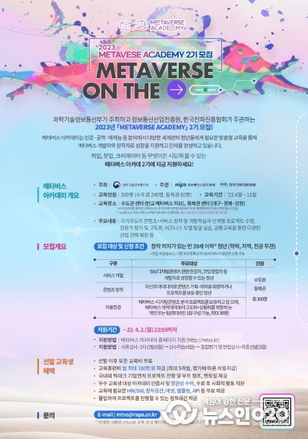 (뉴스인020 = 김나현 기자) 과학기술정보통신부는 메타버스(가상융합세계)산업을 이끌어갈 청년 개발자와 창작자를 양성하기 위해 「메타버스 아카데미」 제2기 참가자를 4월 2일까지 공개 모집한다고 밝혔다.