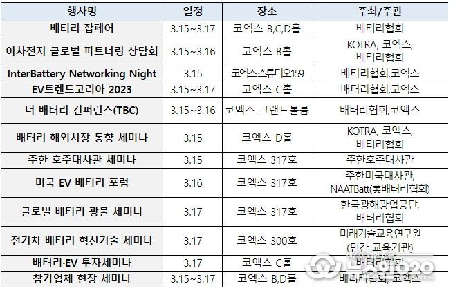 올해로 11번째를 맞이하는 인터배터리 행사는 3.15일부터 3일간 서울 코엑스에서 개최되며, 이번 행사는 역대 최다인 국내·외 477개 기업(1,400부스)이 참가하고 역대 최다인 3.5만명 참가자가 사전 등록하는 등 역대 최대 규모로 치러진다.